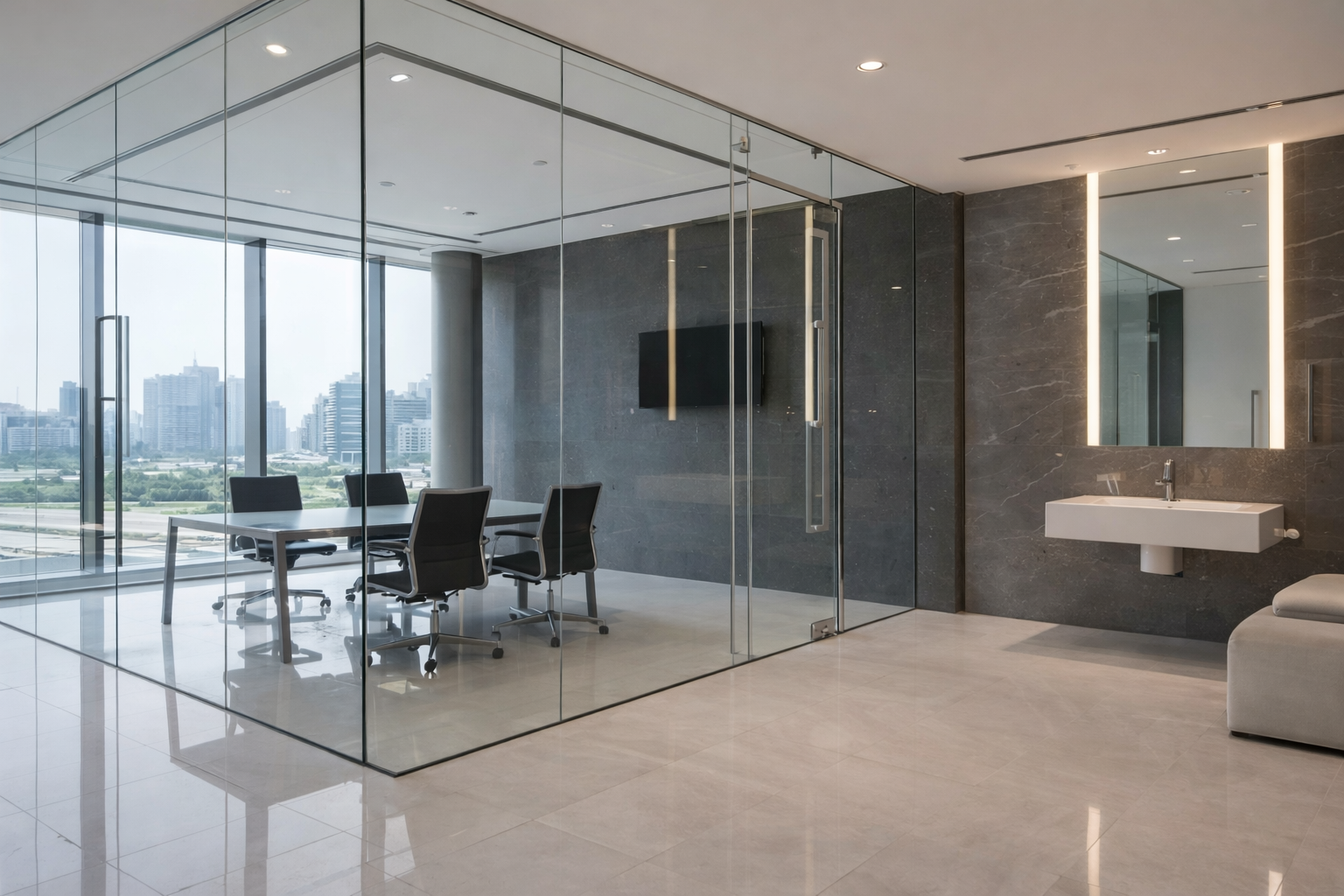 Elegant office partitions, custom shower glass enclosures, back-painted decorative glass, and premium mirror works.