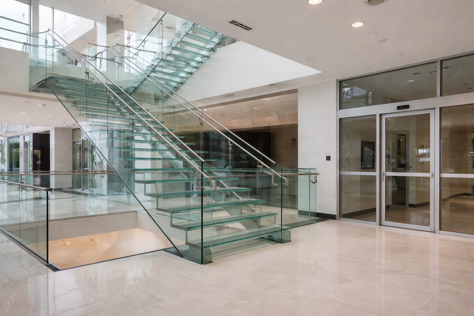 Glass stairs, stainless steel handrails, balustrades, and high-quality automatic door systems.