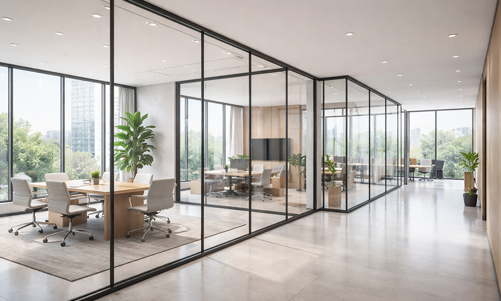 2. Interior Glass Works : From glass partitions and doors to stair railings and shower enclosures, our interior glass solutions create open, elegant, and functional spaces without compromising privacy or safety.